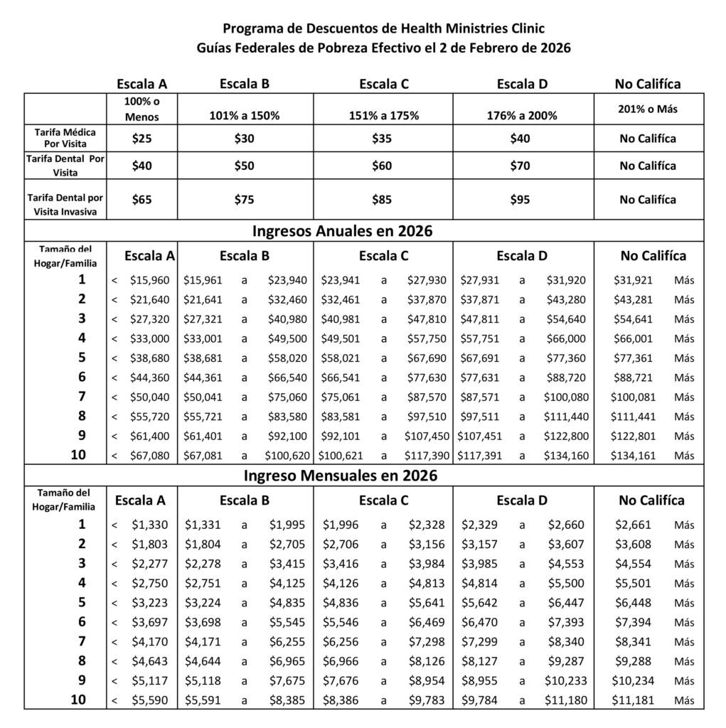 Utilizamos una escala de descuento para cualquier persona que esté en o debajo del 200% del Nivel Federal de Pobreza.